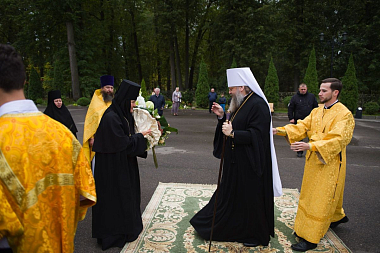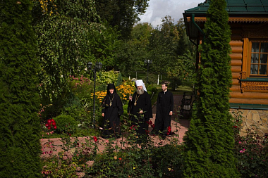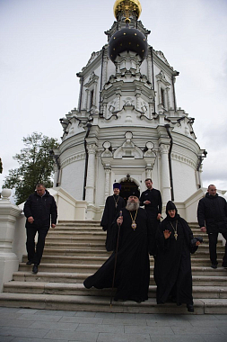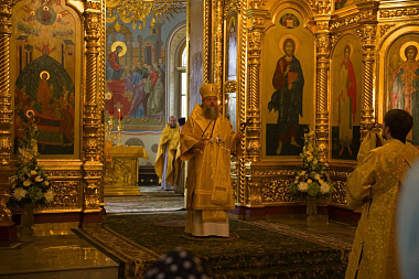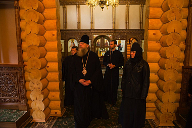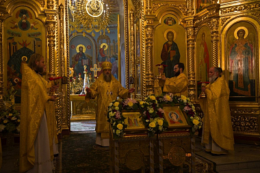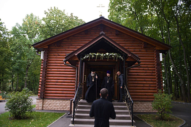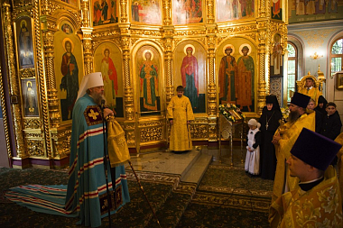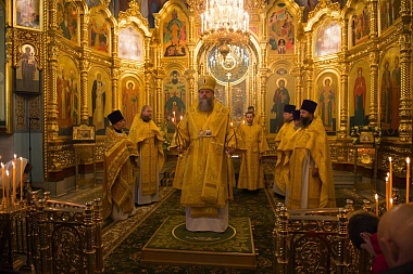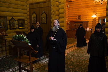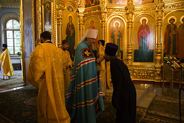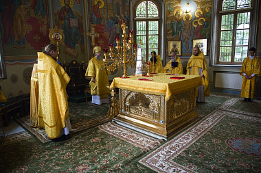 Его Высокопреосвященству сослужили руководитель Аппарата Синодального отдела религиозного образования и катехизации протоиерей Александр Прытков, а также братия храма.