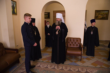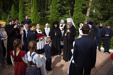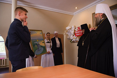 Поэтому слово мое прежде всего к Вам Досточтимая Матушка, а так же наставникам и учителям, всем тем, кто помогает Вам воспитывать в этой гимназии детей. Слово благодарности с низким поклоном и с пожеланием огромной помощи Божией. И конечно, в этом процессе воспитания, духовного созидания личности, должны участвовать не только учителя и ученики. Обязательно в этом процессе должны участвовать родители, потому что если ребенок приходит из гимназии и видит совсем не то, что ему преподавали в школе и сталкивается с неправильным миром восприятия и устройства в своей собственной семье, то, конечно, его жизненный опыт и восприятие этого мира искажается, происходит надлом в душе маленького человека, который долго не заживает, а если заживает, то оставляет после себя рубцы, которые очень тяжело врачуются в душе. Иногда эти раны, несоответствия в семейной, общественной, школьной жизни, духовной жизни печальным опытом могут отозваться в дальнейшей его судьбе. Поэтому обращаюсь сегодня, благодарю Матушку игумению, педагогов за воспитание, и конечно же я обращаюсь к родителям и прошу вас быть верными и мудрыми помощниками в воспитании ваших собственных детей, за которых вы, прежде всего, и несете ответственность перед Богом. Я хотел бы поблагодарить пастырей, которые совершают свое служение здесь в гимназии, духовно назидая, учеников и воспитанников, научая их Закону Божиему, прививая им любовь к Богослужению и Таинствам Святой Церкви.