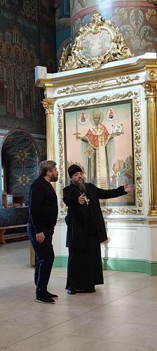 Гостю показали храмы и святыни обители, экспозицию Музея Библии и мемориальные покои митрополита Волоколамского и Юрьевского Питирима (Нечаева), трудами которого начиналось возрождение монастыря.