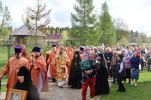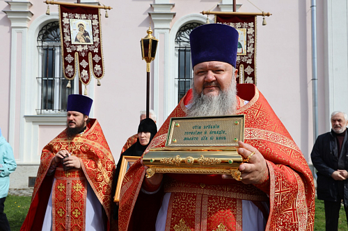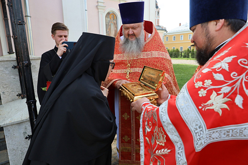 На территории святой обители мощи встречали настоятельница монастыря игумения Фаина (Кулешова) с сестрами. Торжественное принесение святынь и Божественную литургию возглавил митрополит Смоленский и Дорогобужский Исидор.