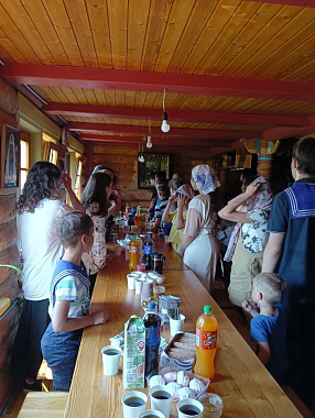 Насельники подворья пригласили гостей на трапезу, где все могли продегустировать монастырскую продукцию. Ребята устроили концерт, в рамках которого прозвучали патриотические песни. Был спет и гимн ушаковцев: «Мы ушаковцы – Родины оплот». Далее отец Сергий постарался для ребят устроить настоящий праздник и преподнес подарок – посещение оленьей фермы, которая располагается в непосредственной близости от подворья в Сумарокове.