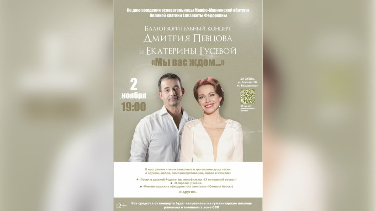 2 ноября 2023 года в Москве в ДК им. С.М. Зуева (станция метро «Белорусская) пройдет благотворительный концерт Дмитрия Певцова и Екатерины Гусевой «Мы вас ждем».