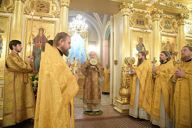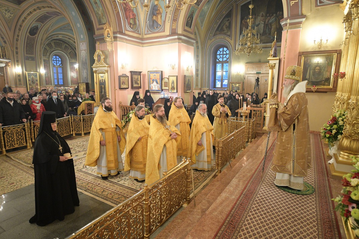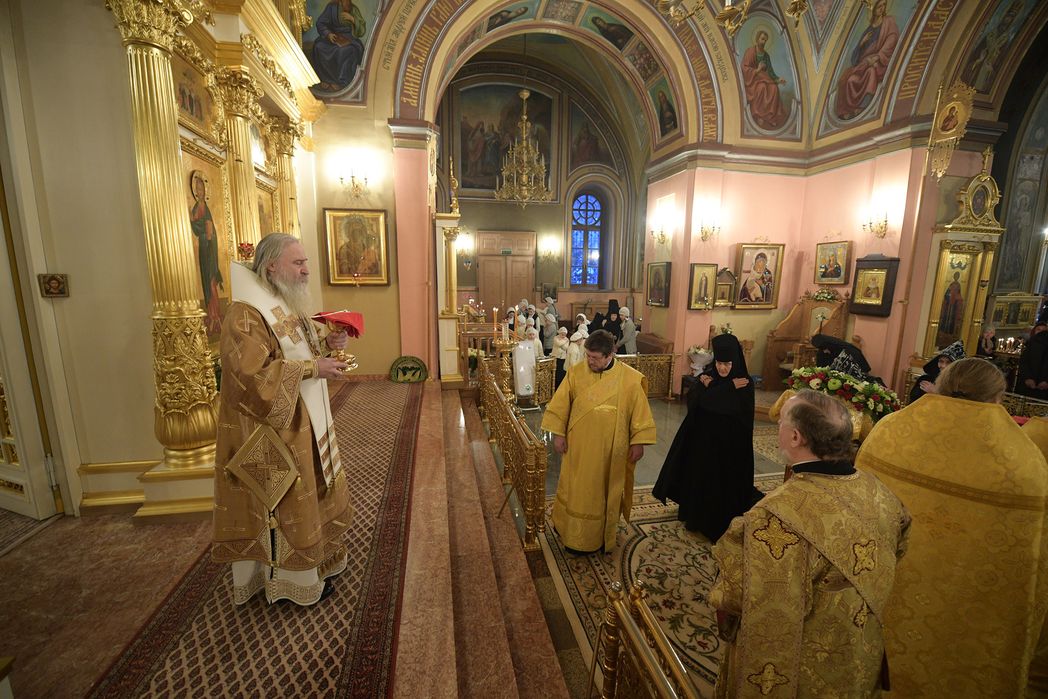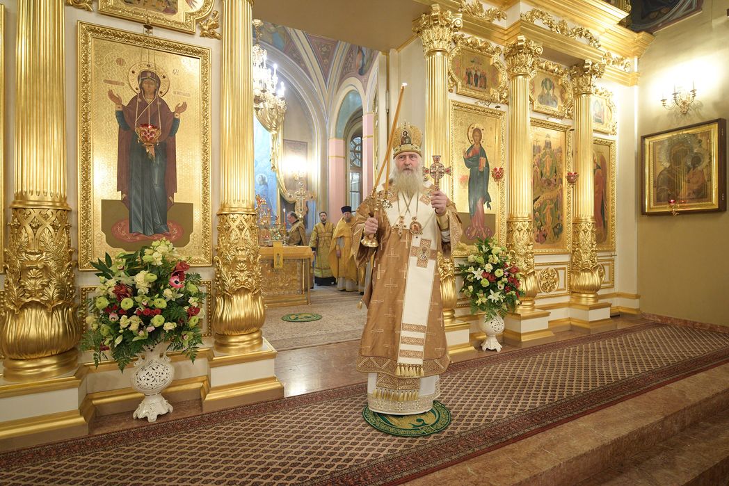 За Божественной литургией в соборе Воскресения Словущего Его Высокопреосвященству сослужили клирики обители.