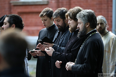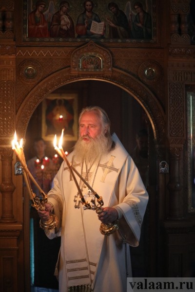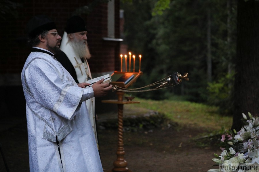 Валаамский храм преподобных отцев, который отапливается только печами, и в котором имеется только свечное освящение, словно погрузился на несколько столетий в прошлое. В полумраке и окружающей церковь лесной тишине богослужение получилось молитвенным, и по-монашески строгим и умилительным.