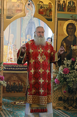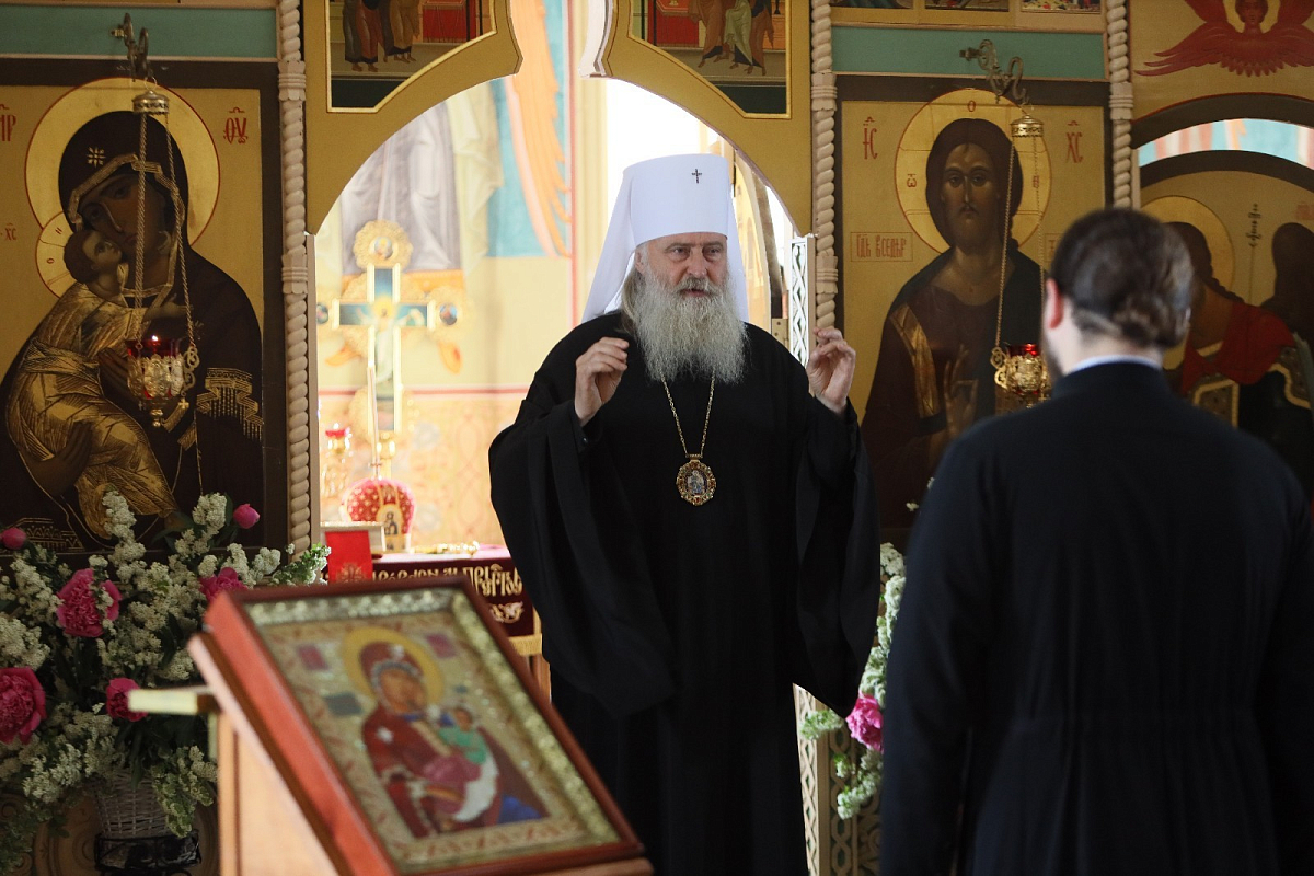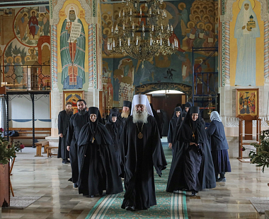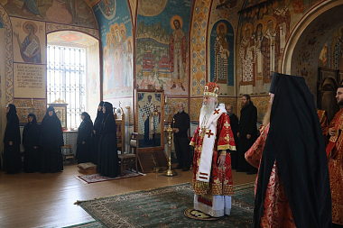 Его Высокопреосвященству сослужили клирик обители протоиерей Владимир Постников и клирик Заиконоспасского ставропигиального мужского монастыря города Москвы иеромонах Савва (Буханцев).