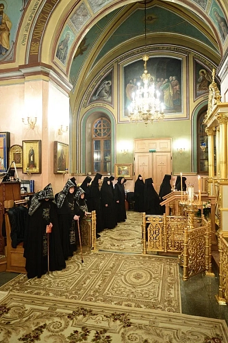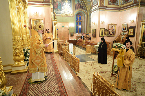 Матушка Феофания с сестрами встретили митрополита Феогноста в соборе Воскресения Словущего, где была совершена Божественная литургия. Его Высокопреосвященству сослужили протоиерей Олег Егоров, благочинный Покровского церковного округа г. Москвы, настоятель храма преподобного Василия Исповедника у Рогожской Заставы; архимандрит Стефан (Тараканов), заместитель председателя СОММ, наместник Саввино-Сторожевского ставропигиального мужского монастыря; клирики Покровской обители. Богослужебные песнопения исполнил хор монастыря.
