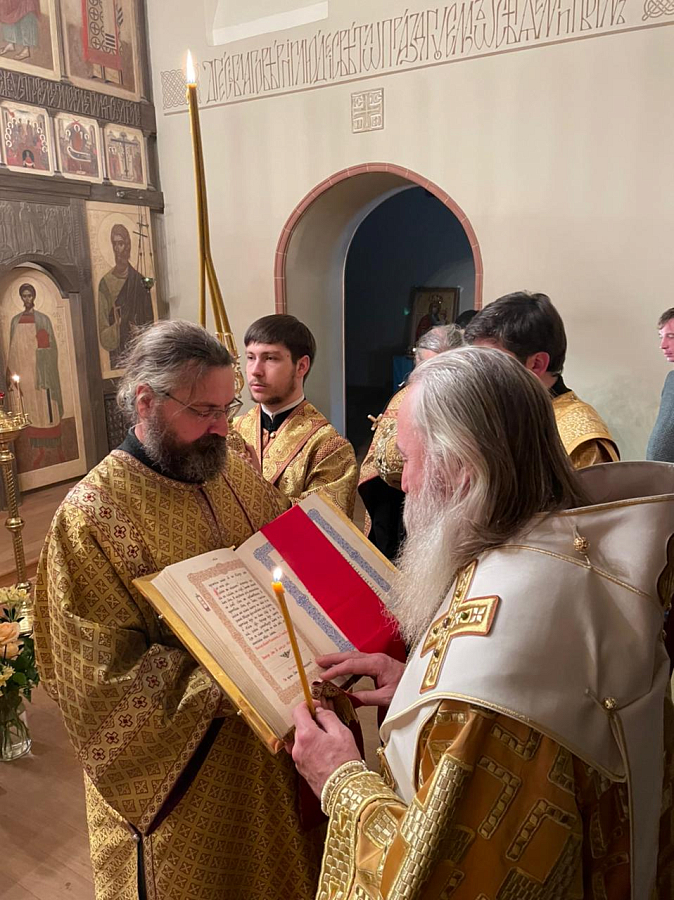 Преосвященным владыкам сослужила братия обители в священном сане.