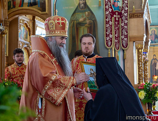 Высокопреосвященнейший Владыка преподнес матушке игумении с сестрами образ преп. Серафима Саровского, пасхальное яйцо и книги издательства Нижегородской епархии.