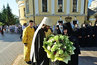 Игумения Феофания поблагодарила владыку за совершенное богослужение и за добрые слова. В подарок архипастырю она преподнесла корзины с дарами монастырских подворий.