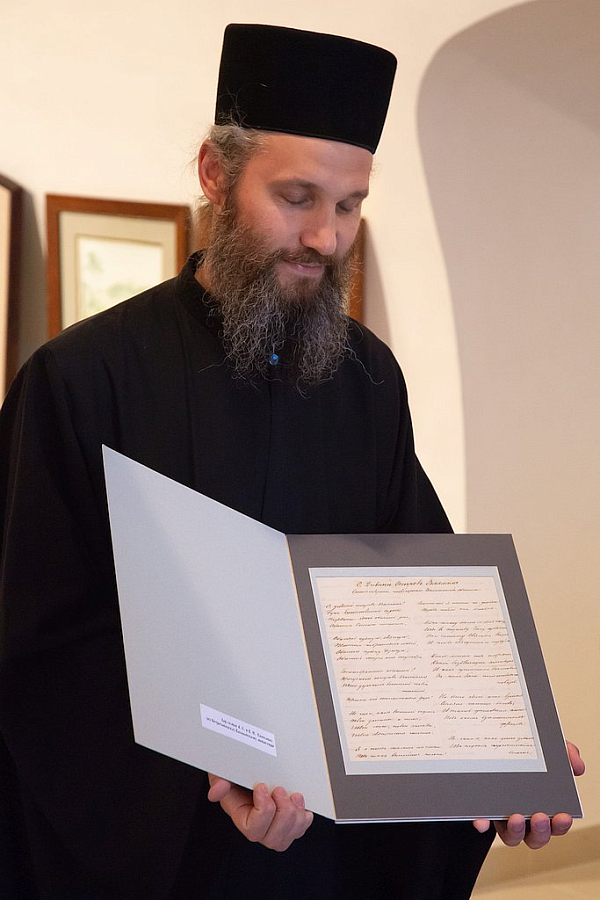 «Мы благодарим вас за щедрость души. Это такое сокровище. Оно попало по адресу – здесь оно будет доступно многим людям. Здесь вся история Валаама, которая, собственно, охватывает историю Руси и вообще нашей русской земли. Этот гимн очень простой по слогу. Валаамский монастырь назывался "мужицкая обитель", потому что приходили крестьяне с благородной доброй душой, труженики и молитвенники. И Петр (Михайлов) написал тогда этот гимн, отразив в нем всю ту любовь и к Валааму, и русской земле, и Богу, объединив те чувства и то множество людей, которые сюда приезжали.