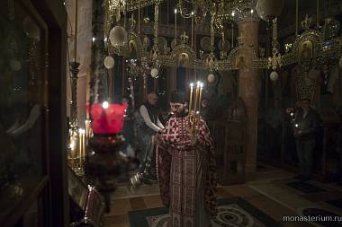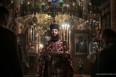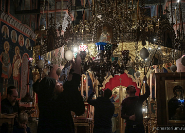 Праздничное богослужение в монастырском храме Святителя Спиридона Тримифунтского началось полунощницей перед Плащаницей Господа Бога и Спаса нашего Иисуса Христа.