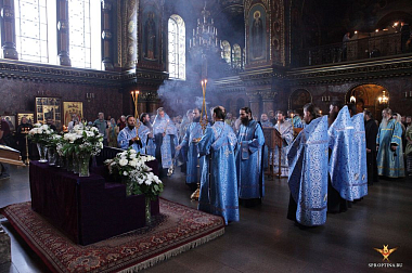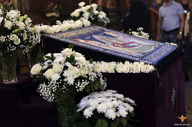 В начале утрени священнослужители подворья вынесли Плащаницу с изображением Пресвятой Богородицы, почивающей на одре, на середину церкви. Затем владыка наместник с братией прочитал акафист Успению Пресвятой Богородицы.