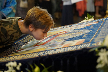 После чтения Святого Евангелия отцы, братия и все молящиеся воздали поклонение Пресвятой Богородице, приложившись к Плащанице с Ее изображением.
