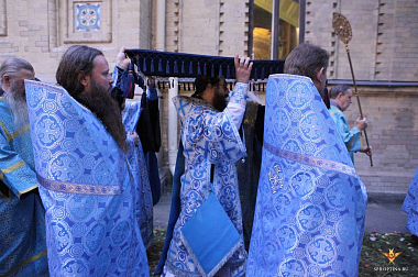 В тот же день вечером на подворье состоялось всенощное бдение с чином погребения Пресвятой Богородицы. В начале утрени были прочитаны умилительные «Похвалы на святое преставление Пресвятыя Владычицы нашея Богородицы и Приснодевы Марии» со стихами 17-й кафизмы. После великого славословия при пении молитвы «Святый Боже» епископ Леонид с духовенством подворья и всеми верующими прошел крестным ходом со святой Плащаницей вокруг храма. Каждый смог помолиться Богородице и попросить Ее помощи, Ее Небесного предстательства.