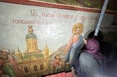 Сейчас специалисты занимаются реставрацией настенной живописи в интерьерах храма. С фресок бережно удаляют загрязнения, прежде всего сажу, и укрепляют слой из красок.