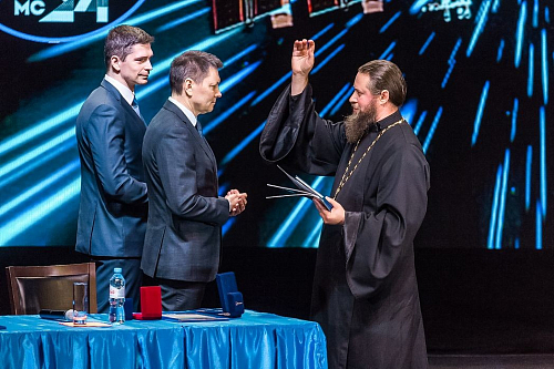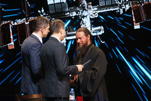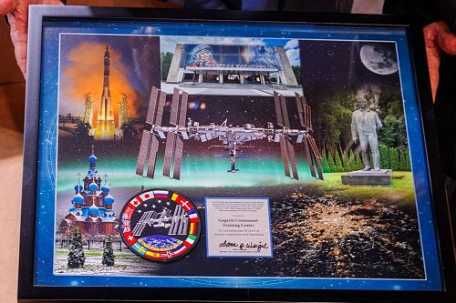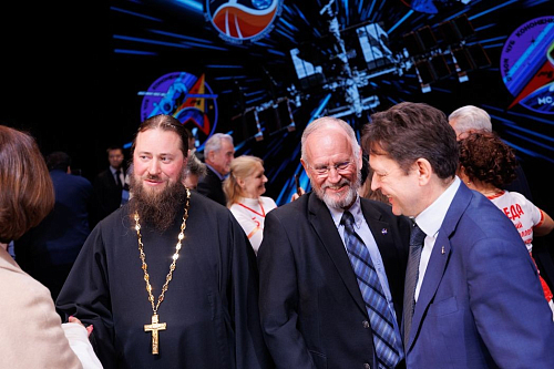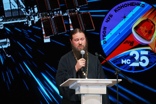 Отец Пафнутий выступил с приветственным словом и подарил космонавтам памятные подарки – книги о храме Преображения Господня в Звездном городке и храмовый календарь на 2025 год с наставлениями святых отцов Церкви о космосе и о сотворении Земли.