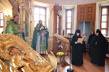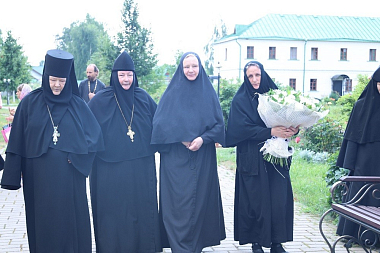 Поздравить игумению Марию прибыли настоятельница Покровского Хотькова ставропигиального монастыря игумения Олимпиада (Баранова) с сестрами и настоятельница Свято-Троицкого Александро-Невского ставропигиального монастыря с. Акатово игумения Антония (Минина).