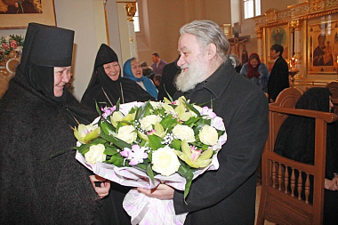 По окончании Литургии клирик Кресто-Воздвиженского Иерусалимского монастыря иеромонах Дионисий (Локтаев) огласил поздравление Святейшего Патриарха Московского и всея Руси Кирилла игумении Екатерине по случаю дня ее тезоименитства.