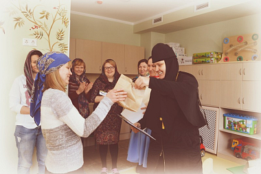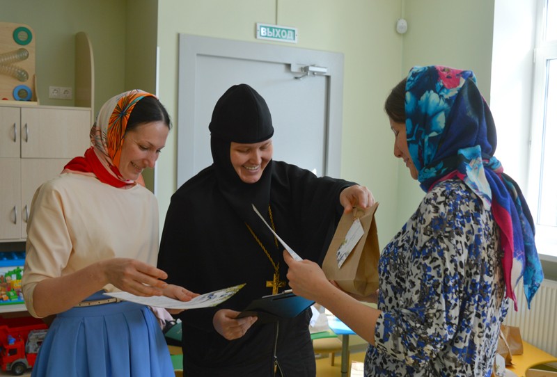 После краткого вступительного слова настоятельница Марфо-Мариинской обители милосердия игумения Елисавета (Позднякова) с благодарностью вручила добровольцам почетные грамоты и памятные подарки и пригласила на экскурсию по зданию садика.
