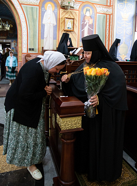 По окончании богослужения архимандрит Павел передал настоятельнице монастыря игумении Елисавете (Жегаловой) поздравление со знаменательной датой от Святейшего Патриарха Московского и всея Руси Кирилла.