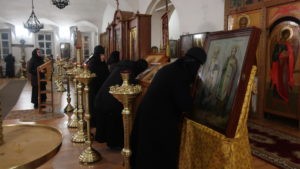 На участке, где захоронен отец Михаил, была отслужена панихида. Сестры молились о упокоения протоиерея Михаила и просили у Господа помощи за его молитвы. Далее отец Никодим пригласил сестер посетить храм обители. По дороге отец Никодим рассказал, что кладбище расположено на монастырских землях, что монастырь в советские годы был закрыт и уничтожен, показал на кладбище могилу насельника монастыря, жившего в страшные годы гонений.