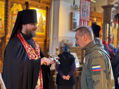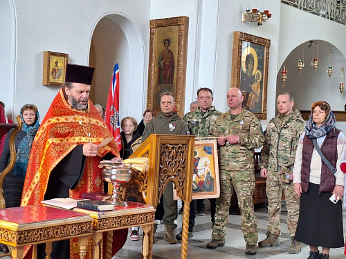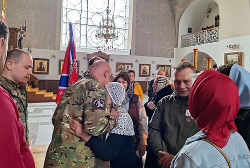 В богослужении приняли участие военнослужащие добровольческого отряда имени святого благоверного князя Александра Невского. Игумен Иосиф (Крюков) тепло и сердечно поприветствовал бойцов с амвона, пожелав им Божией помощи.