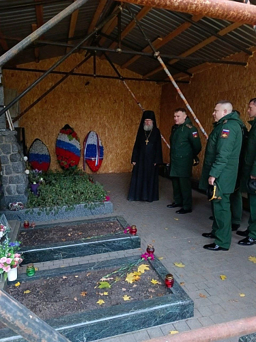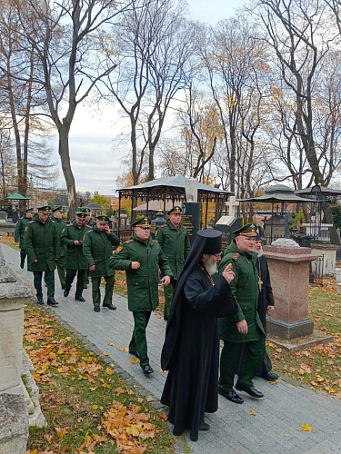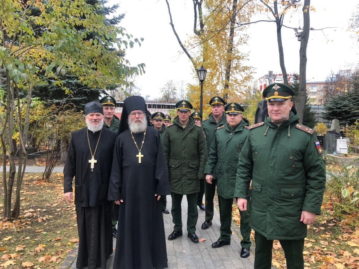 В Большом соборе офицеры приложились к святыням – Донской иконе и мощам святителя Тихона, Патриарха Всероссийского. Затем иеромонах Авраам провел краткую экскурсию по Донскому некрополю. Особое внимание уделили воинским захоронениям Деникина, Капеля и героям войны 1812 года.