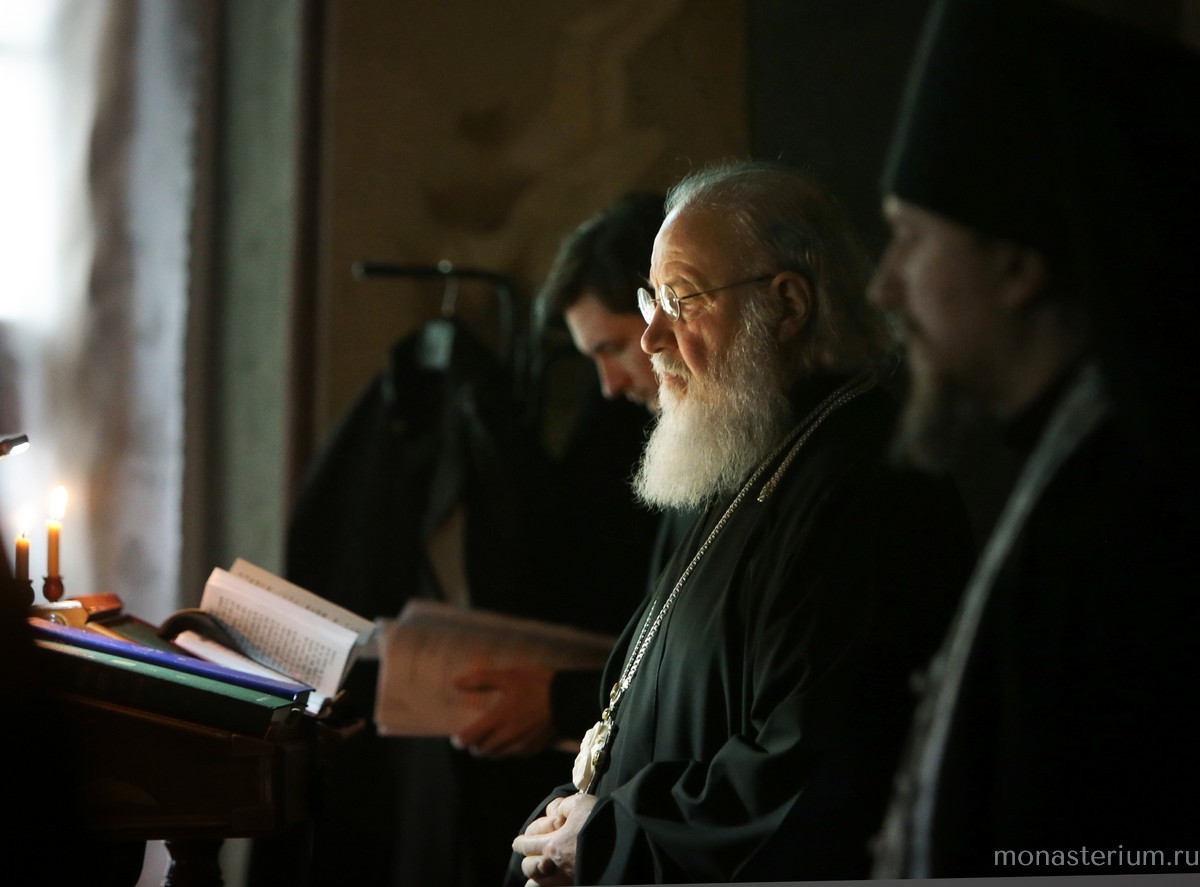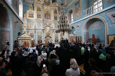 Утреня, часы, изобразительны и вечерня были совершены в верхней церкви в честь иконы Божией Матери «Всех скорбящих Радость» Спасского собора обители.