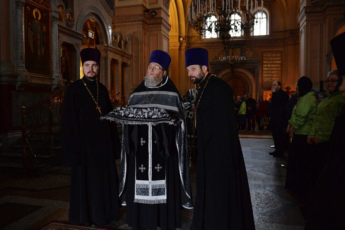 Тропарь утрени «Се Жених» и светилен «Чертог Твой» исполнили протодиакон Константин Барган, иеродиаконы Афанасий (Гелич) и Андрей (Данилов).