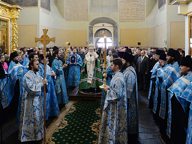 7 апреля 2017 года, в праздник Благовещения Пресвятой Богородицы и день преставления святителя Тихона, Патриарха Московского и всея России, Святейший Патриарх Московский и всея Руси Кирилл совершил молебен в Большом соборе Донского ставропигиального мужского монастыря Москвы, где находится рака с честными мощами святителя Тихона.