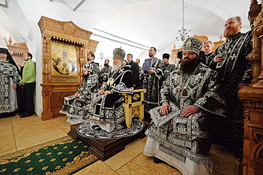 Его Святейшеству сослужили: архиепископ Венский и Будапештский Антоний; епископ Бронницкий Парамон, наместник Донского монастыря; насельники Донской обители в священном сане.