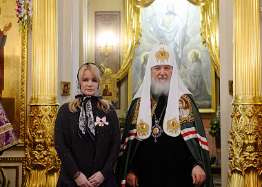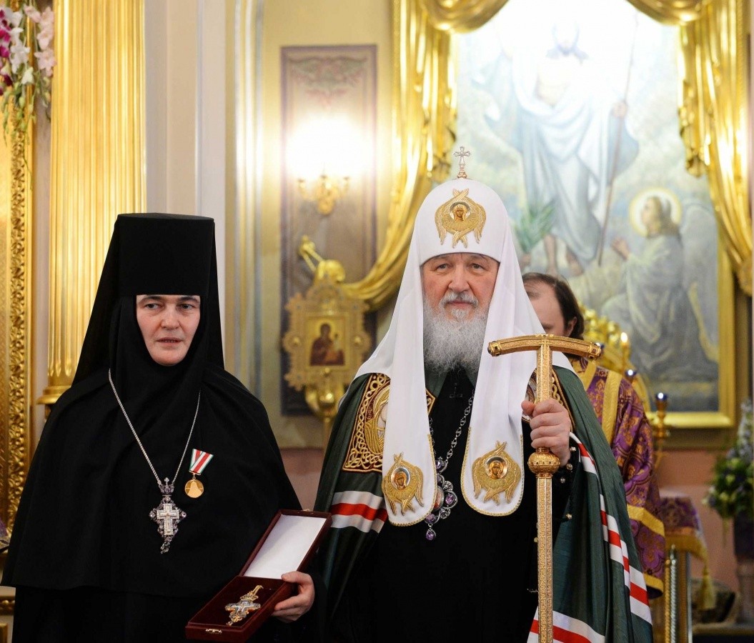 Святейший Патриарх Кирилл также выразил благодарность игумении Феофании за труды, понесенные в течение 20 лет служения в качестве настоятельницы Покровского монастыря, и вручил ей наперсный крест.