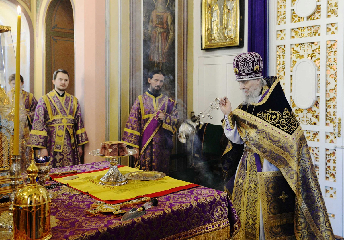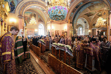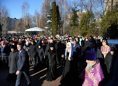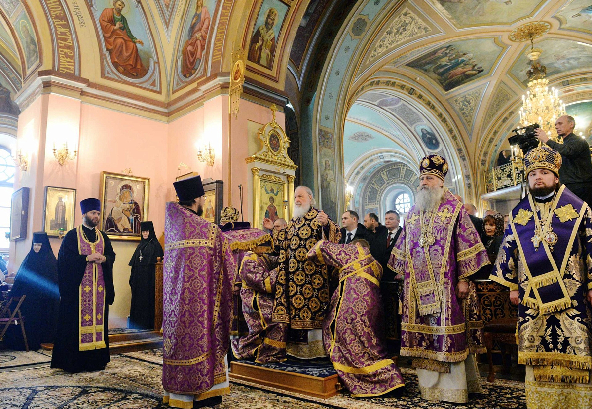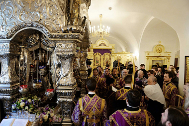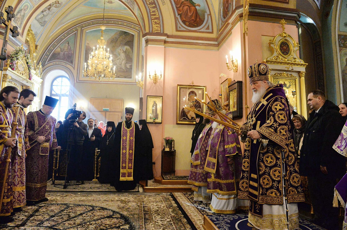 По прибытии в обитель Святейший Патриарх Кирилл поклонился честным мощам блаженной старицы, почивающим в Покровском храме, а затем в храме Воскресения словущего совершил вечерню и Литургию Преждеосвященных Даров.