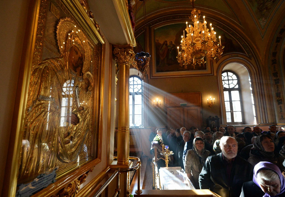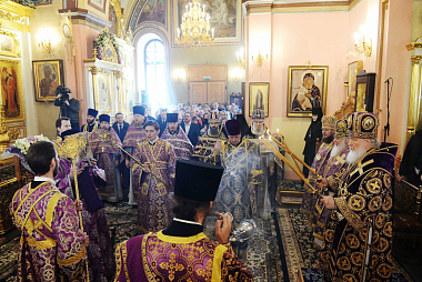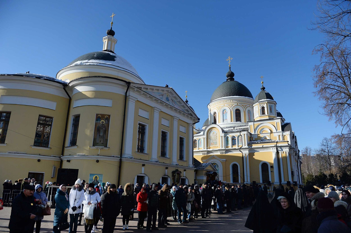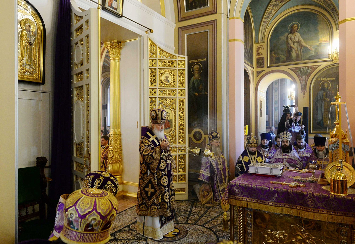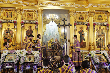 По прибытии в обитель Святейший Патриарх Кирилл поклонился честным мощам блаженной старицы, почивающим в Покровском храме, а затем в храме Воскресения словущего совершил вечерню и Литургию Преждеосвященных Даров.
