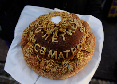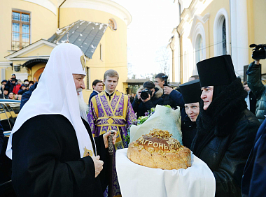 По окончании Литургии игумения Феофания (Мискина) приветствовала Святейшего Владыку и преподнесла Его Святейшеству икону святой Матроны.