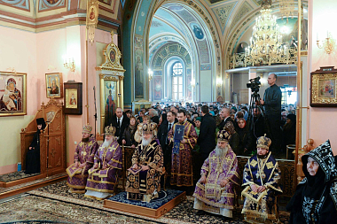 Его Святейшеству сослужили: митрополит Истринский Арсений, первый викарий Патриарха Московского и всея Руси по г. Москве; архиепископ Сергиево-Посадский Феогност, наместник Троице-Сергиевой лавры, председатель Синодального отдела по монастырям и монашеству; епископ Сорокский Иоанн, викарий Кишиневской епархии; епископ Люберецкий Серафим, председатель Синодального отдела по делам молодежи; протопресвитер Владимир Диваков, секретарь Патриарха Московского и всея Руси по г. Москве; архимандрит Савва (Тутунов), заместитель управляющего делами Московской Патриархии; протоиерей Даниил Андреюк, представитель Православной Церкви в Америке при Московской Патриаршем престоле; протоиерей Андрей Марущак, клирик кафедрального соборного Храма Христа Спасителя г. Москвы; клирики Покровской обители; столичное духовенство.