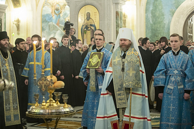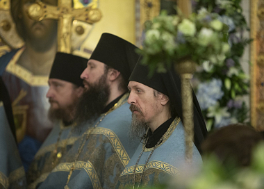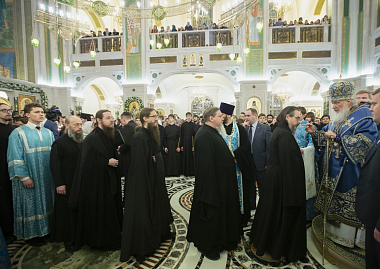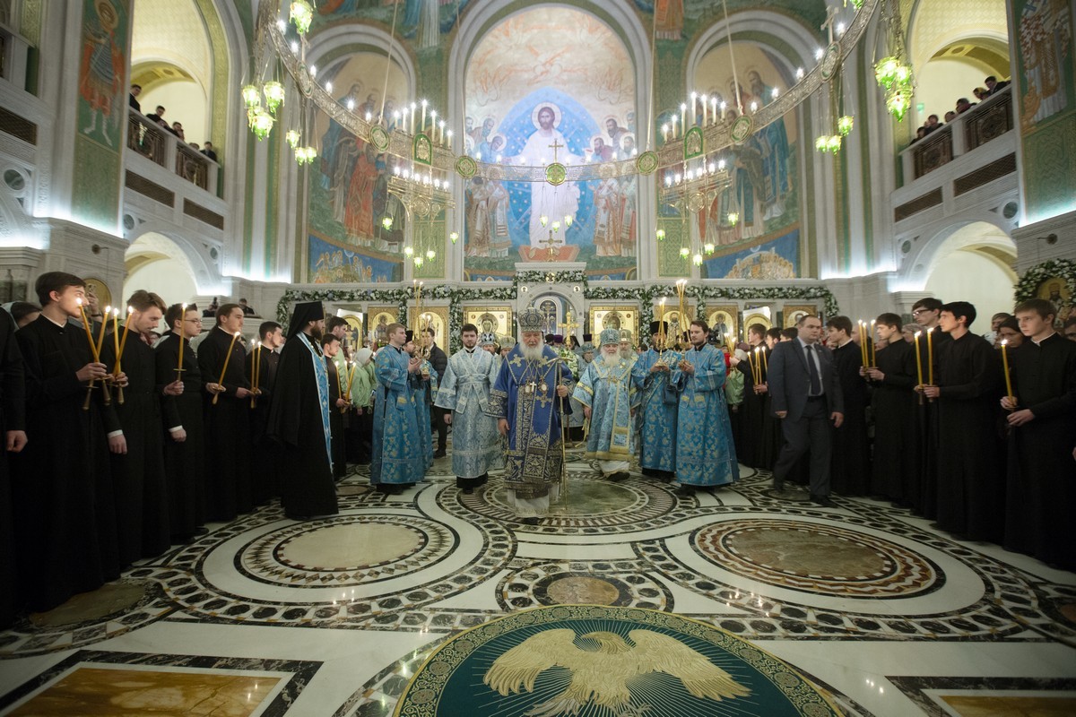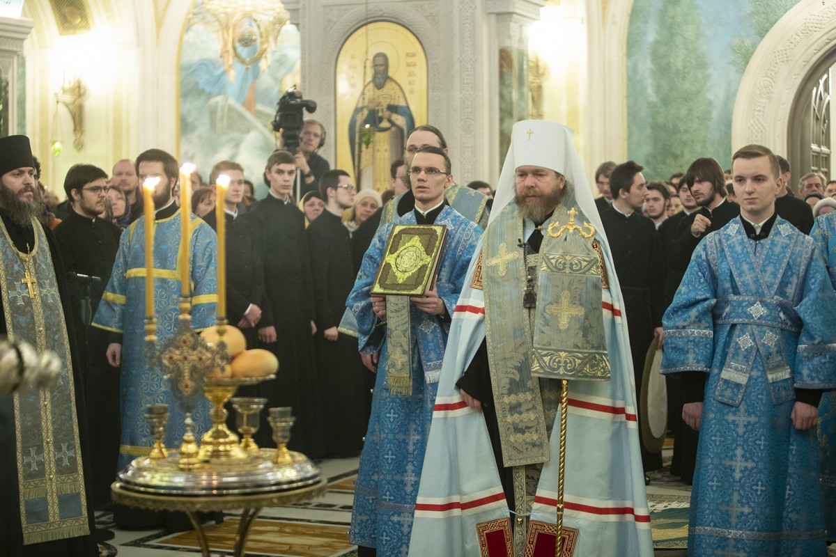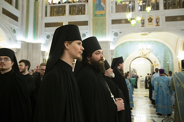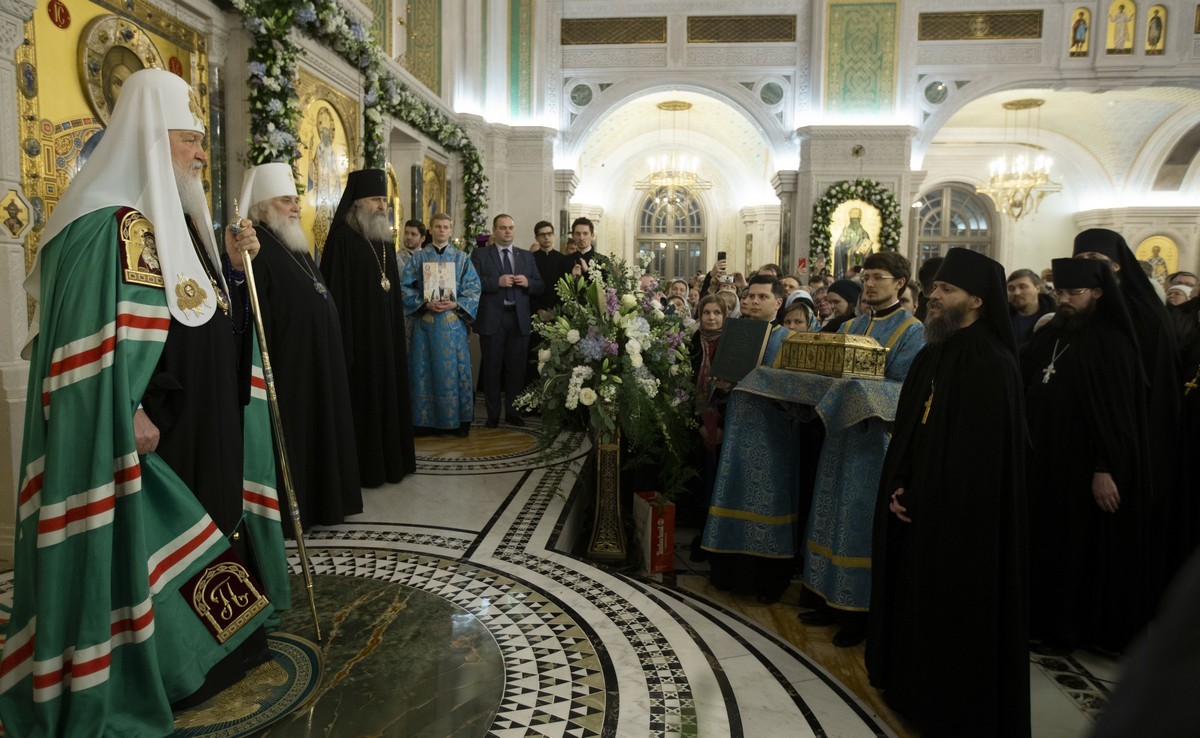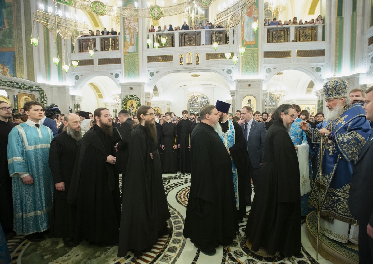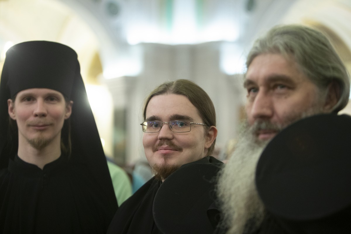 Его Святейшеству сослужили: митрополит Истринский Арсений, первый викарий Патриарха Московского и всея Руси по г. Москве; митрополит Псковский и Порховский Тихон, председатель Патриаршего совета по культуре; архиепископ Сергиево-Посадский Феогност, председатель Синодального отдела по монастырям и монашеству, наместник Свято-Троицкой Сергиевой лавры; епископ Воскресенский Дионисий; протопресвитер Владимир Диваков, секретарь Патриарха Московского и всея Руси по г. Москве; иеромонах Иоанн (Лудищев), и.о. наместника Сретенского ставропигиального монастыря; протоиерей Олег Клемышев, благочинный Сретенского округа, настоятель храма Успения Пресвятой Богородицы в Печатниках г. Москвы; насельники Сретенского монастыря в священном сане.