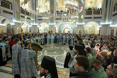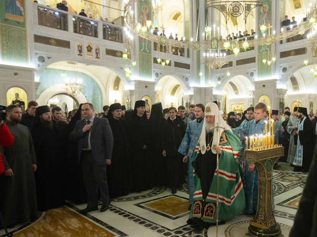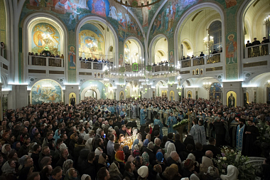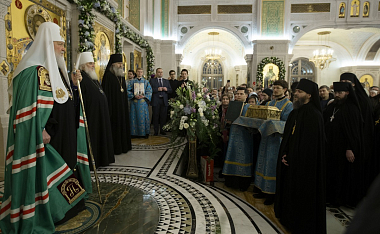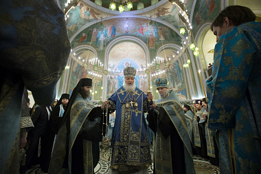 По прибытии в храм Воскресения Христова и Новомучеников и исповедников Церкви Русской Святейший Патриарх поклонился честным мощам священномученика Илариона (Троицкого), архиепископа Верейского. Затем Предстоятель Русской Православной Церкви возглавил служение всенощного бдения.