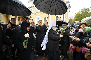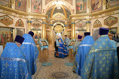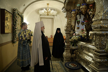 Перед началом богослужения митрополит Павел поклонился раке с мощами святой блаженной Матроны Московской, которая установлена на первом этаже Покровского храма.