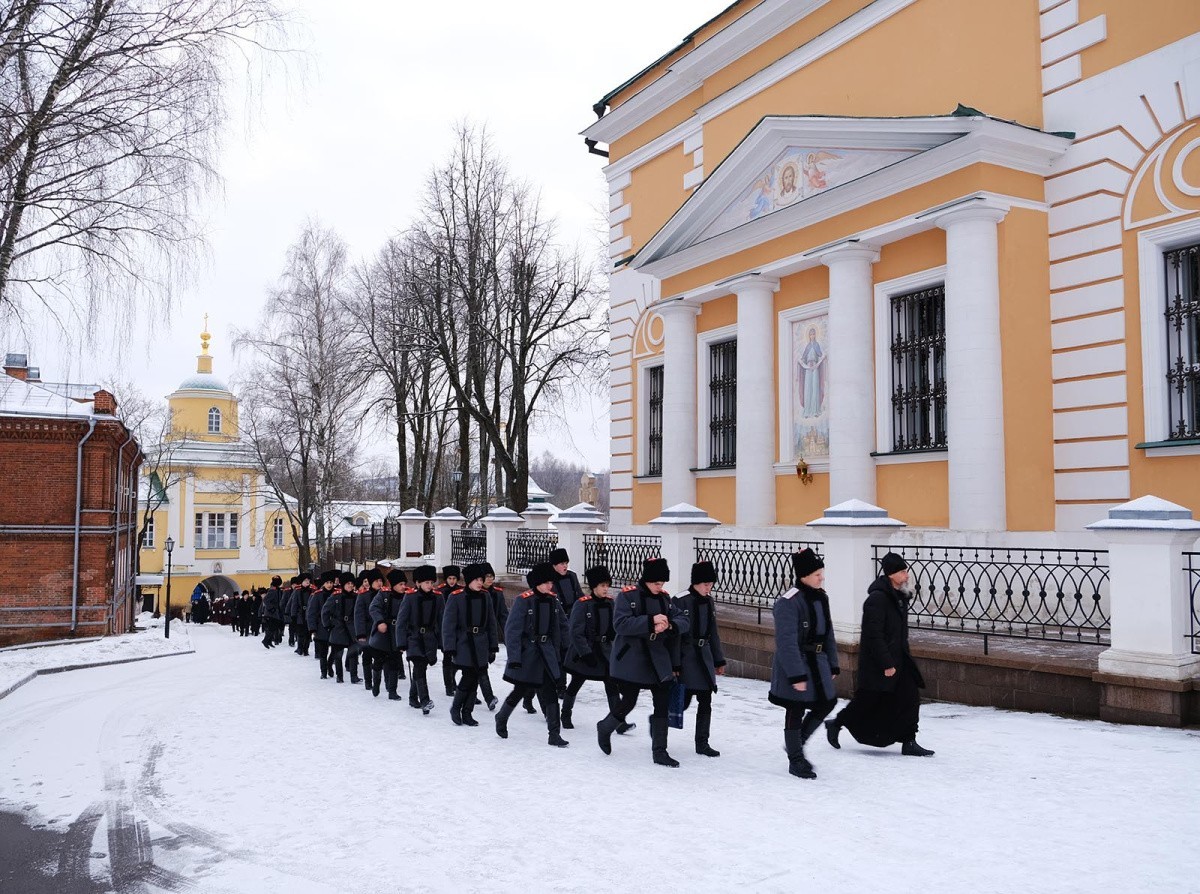 В Никольском соборе обители гостей встретила настоятельница монастыря игумения Олимпиада (Баранова). Здесь ребята исполнили рождественские песнопения, колядки, военные песни для сестер монастыря, воспитанников пансиона и сотрудников. В заключение матушка игумения поблагодарила певцов и пожелала всем стать достойными сыновьями и дочерьми Отечества и своей жизнью прославить Христа.