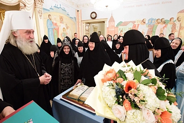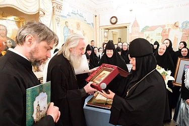 За трапезной игумения Феофания от лица сестер обители поздравила митрополита Феогноста с памятной датой – 40-летием монашеского пострига и преподнесла в подарок икону Пресвятой Богородицы «Скоропослушница». Сестринский хор исполнил поздравительные канты.