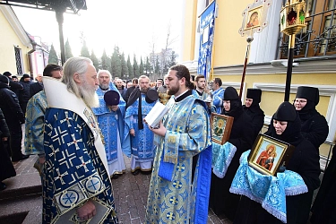 По окончании Литургии состоялся молебен и крестный ход вокруг Воскресенского собора обители. У мощей блаженной Матроны Московской владыка Феогност прочитал молитву праведной старице. На протяжении всего крестного хода духовенство окропляло многочисленных верующих святой водой.