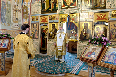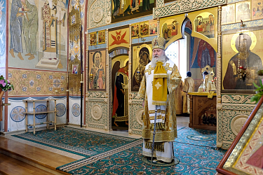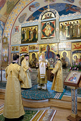 Его Высокопреосвященству сослужили штатный клирик обители протоиерей Владимир Постников и клирик Заиконоспасского мужского ставропигиального монастыря Москвы иеромонах Савва (Буханцев).