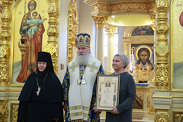 В завершение владыка вручил Патриаршую грамоту реставратору и иконописцу Т.Н. Мусаткиной, трудами которой была отреставрирована Иерусалимская икона Божией Матери. Чтимый список Иерусалимского образа Пресвятой Богородицы был на подворье монастыря в Москве – в храме Иерусалимской иконы Божией Матери – с момента его освящения в 1912 году и до закрытия в 1935 году. Образ возвращен вновь подворью в 2021 году.