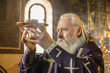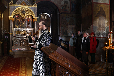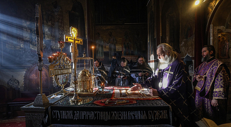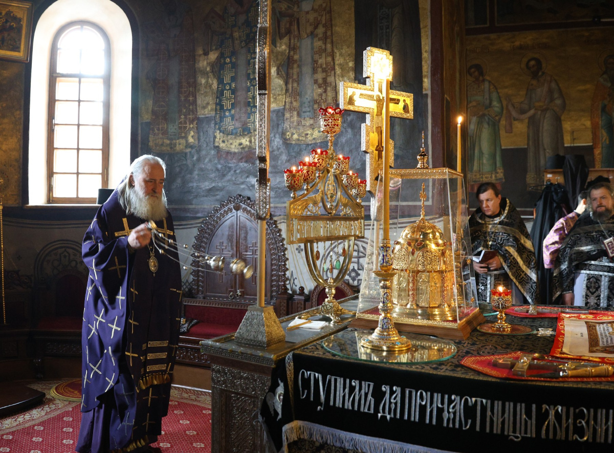 20 марта 2026 года, в праздник священномучеников, в Херсонесе епископствовавших: Василия, Ефрема, Капитона, Евгения, Еферия, Елпидия и Агафодора (IV), председатель Синодального отдела по монастырям и монашеству, наместник Донского ставропигиального мужского монастыря митрополит Каширский Феогност совершил Литургию Преждеосвященных Даров в соборе Рождества Богородицы Саввино-Сторожевского ставропигиального мужского монастыря.