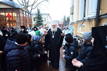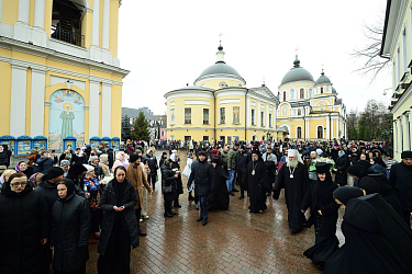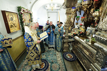 По прибытии в обитель архипастыри поклонились честным мощам блаженной Матроны Московской, почивающим в Покровском храме, а затем возглавили Божественную литургию в храме Воскресения Словущего.