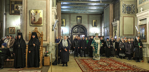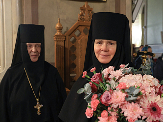 Затем митрополит Феогност огласил поздравление Святейшего Патриарха Московского и всея Руси Кирилла игумении Ксении по случаю дня ее тезоименитства.