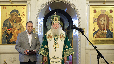 Далее Высокопреосвященнейший владыка вручил Патриаршую награду – орден преподобного Серафима Саровского – бывшему генеральному директору компании «Элкод» Аркадию Бениаминовичу Гершкович «за оказание помощи Алексеевскому монастырю».