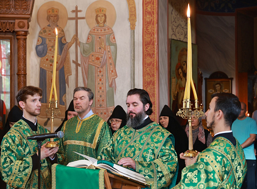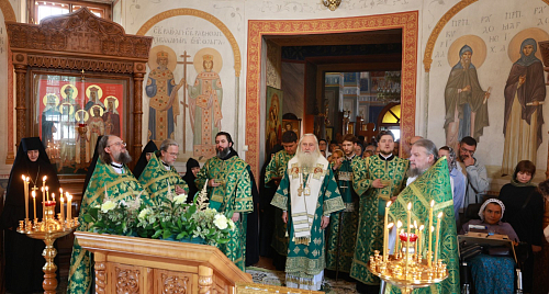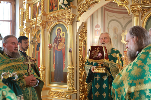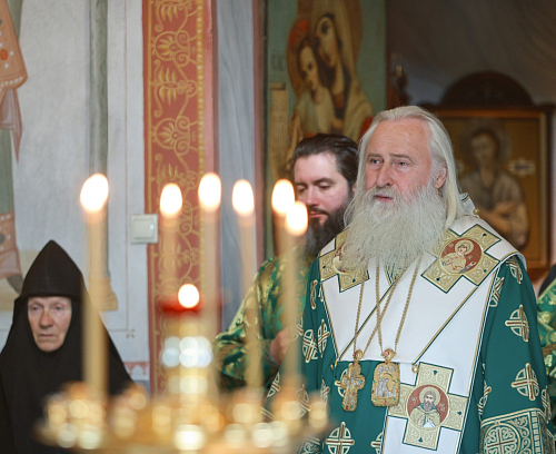 Праздничную Божественную литургию в Троицком соборе возглавил председатель Синодального отдела по монастырям и монашеству, наместник Донского ставропигиального мужского монастыря митрополит Каширский Феогност.