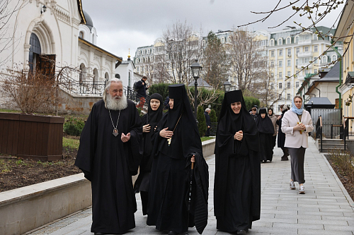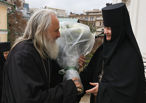 По прибытии в монастырь митрополит Феогност поздравил игумению Иулианию с днем рождения и вручил ей букет цветов.
